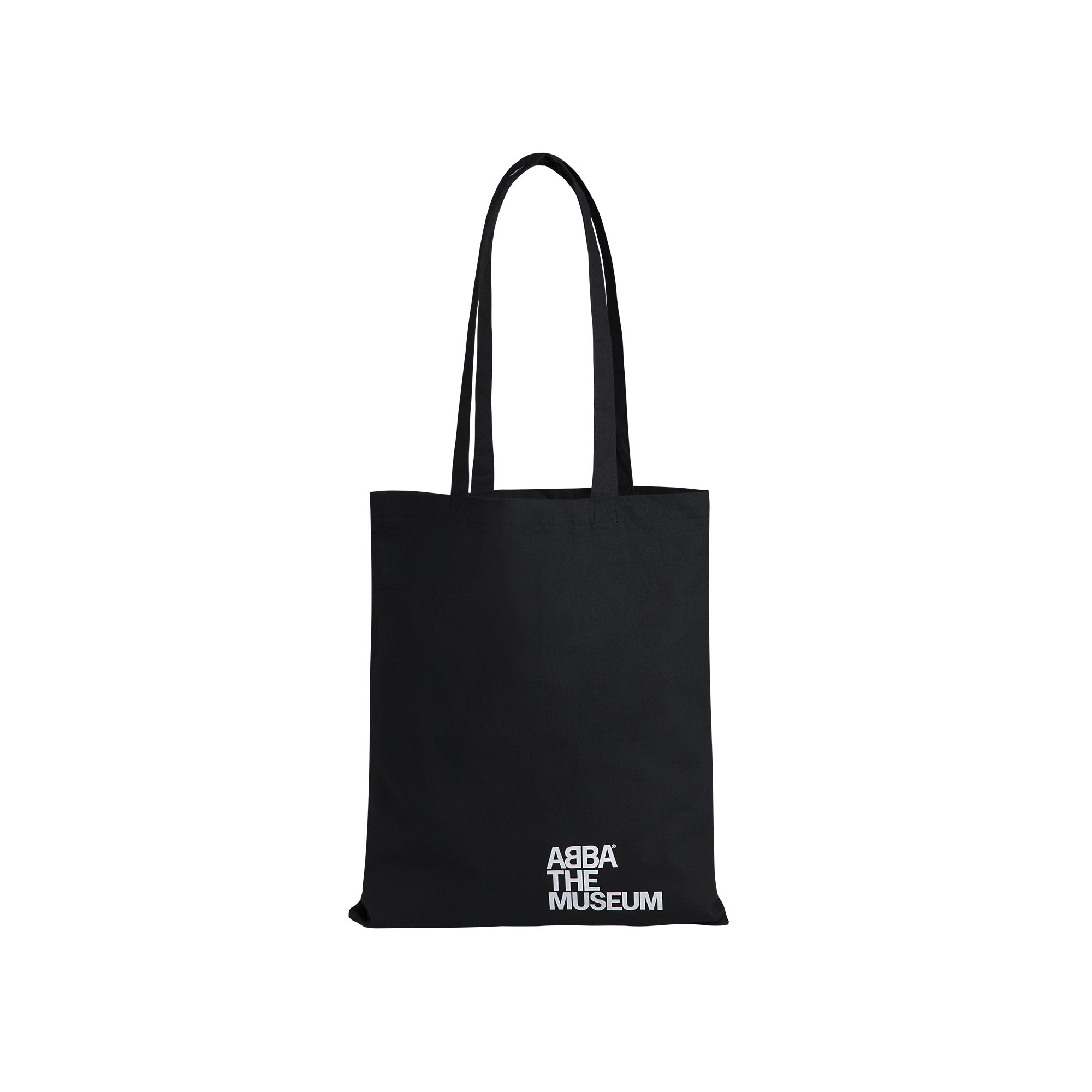 ABBA The Museum Tote Bag is a black tote bag with white print of ABBA’s four band members on one side, and ABBA The Museum Logo on the other.