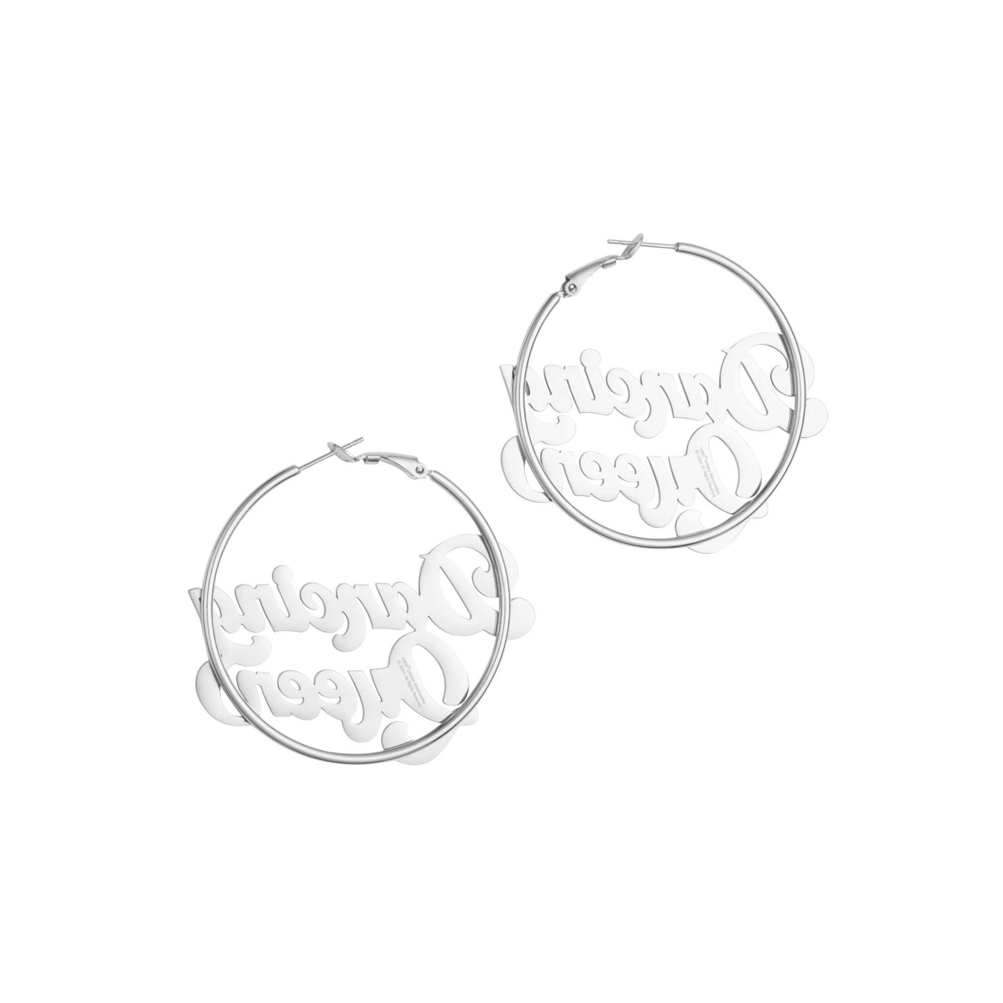 Each hoop has a diameter of 5 cm and a thickness of 0.2 cm, providing a bold yet refined aesthetic. Size of Dancing Queen logo 5,7 cm and 0,1 cm thick. Weight: 9 gram per earring.